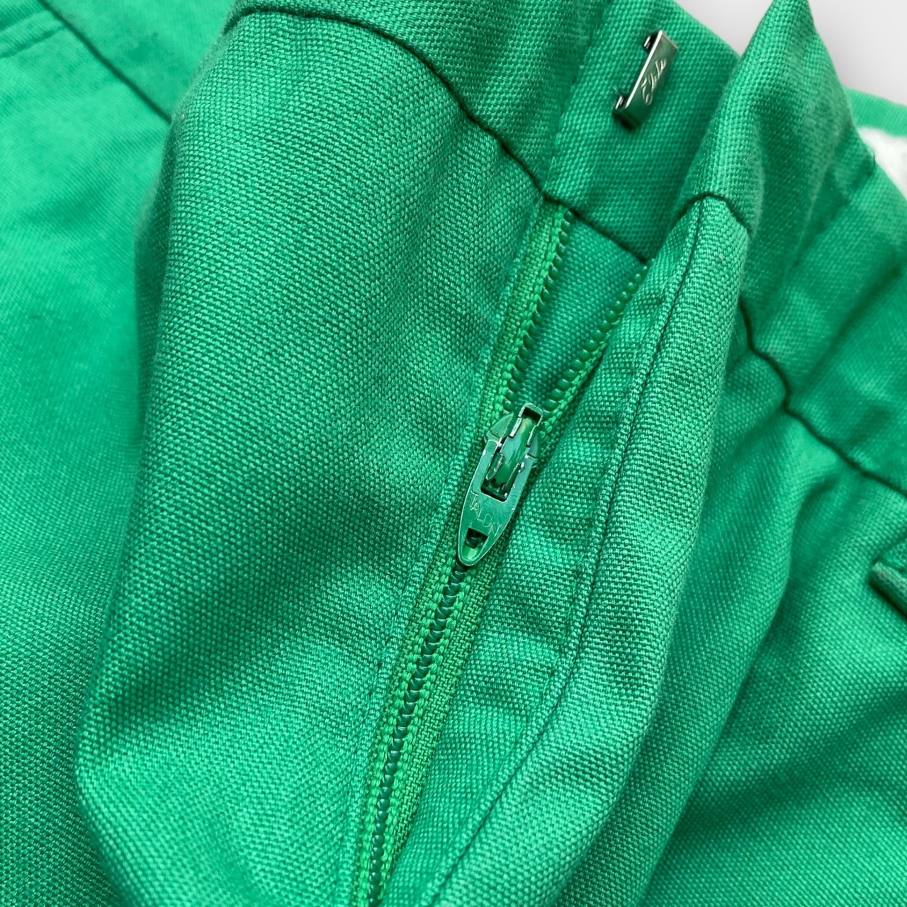 70s-80s color cotton slacks TALONZIPは、アメリカ製のヴィンテージな雰囲気漂うスラックスです。グリーンカラーの生地が、どんなコーディネートにもアクセントを加えてくれます。タロンジップが施されたヴィンテージなディテールもポイント。