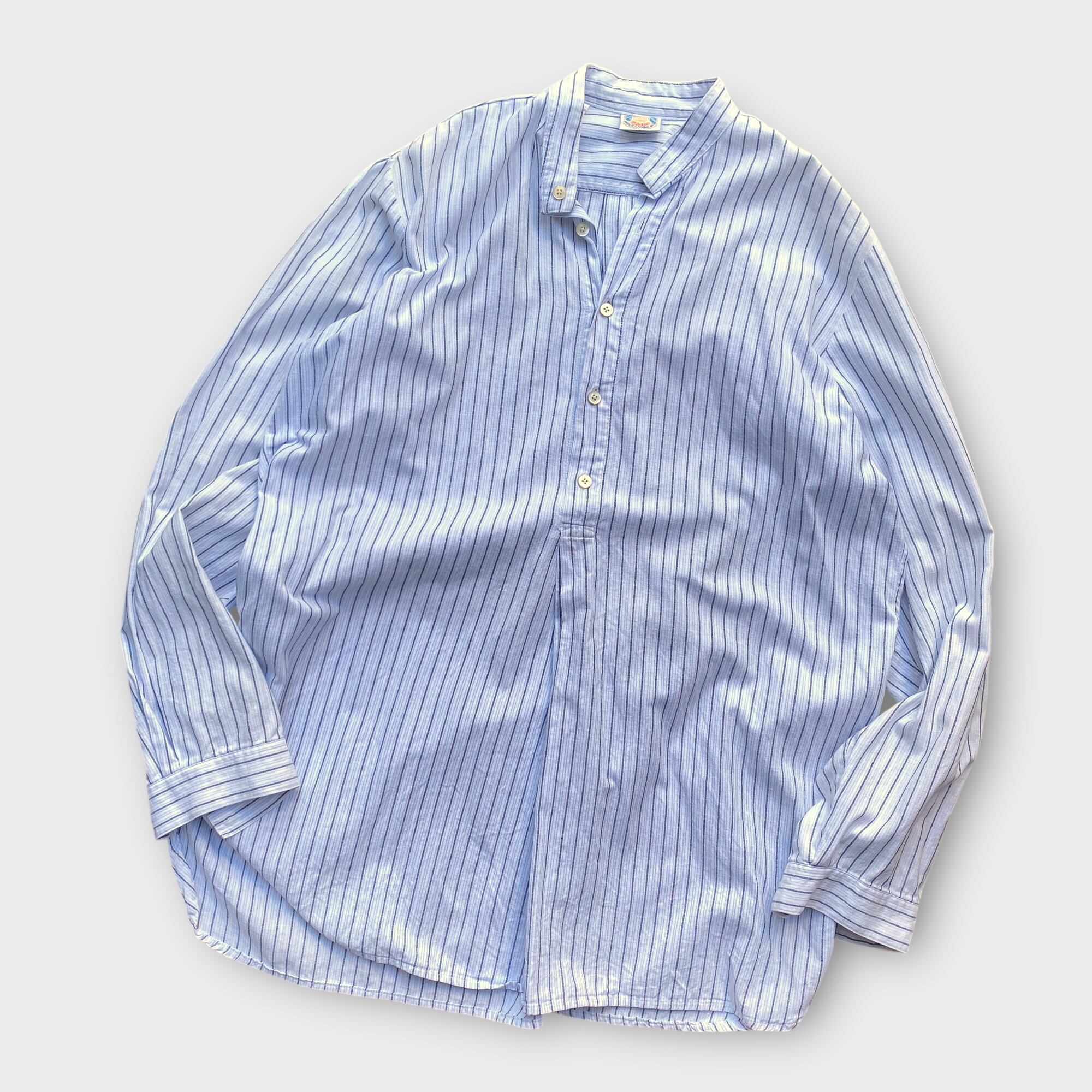 水色とネイビーのストライプが上品な70s-80sグランパシャツをご紹介します。爽やかな色合いと縦のストライプが、スタイリッシュな印象を与えます。長すぎず短すぎないちょうど良い着丈で、インやアウトどちらでもおしゃれに楽しめるデザインです。