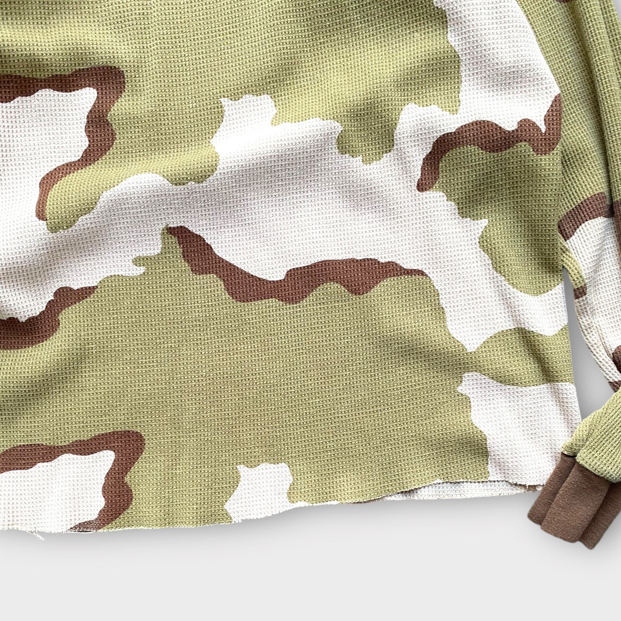 この季節に、00s- desert camouflage thermal T-shirtがおすすめです。サーマル素材なので、一枚でも快適な着用感が楽しめ、さらにインナーとしても活躍してくれます。デザートカモフラージュ柄がアクセントになり、コーディネートのポイントとしてお使いいただけます。