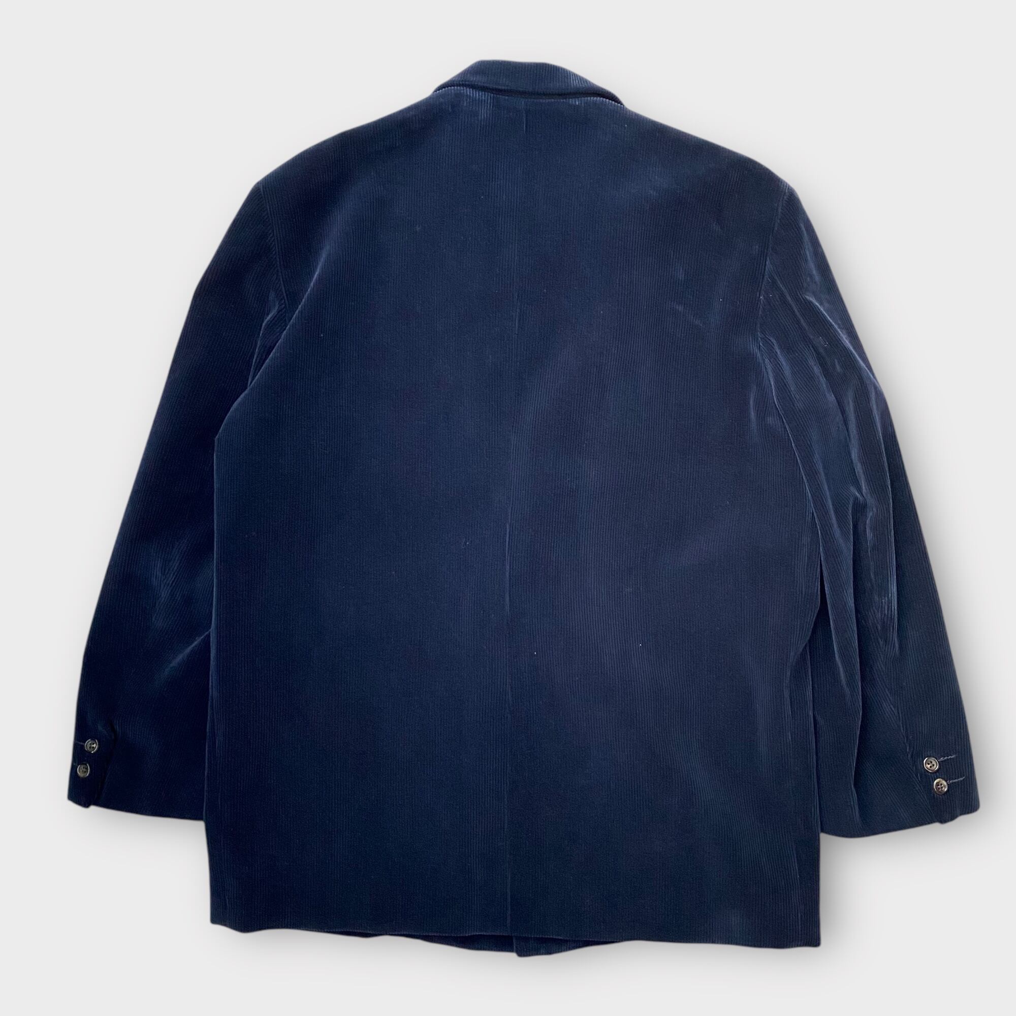 手触りの良いコーデュロイ素材を使用した、高級感のある印象のダブルブレストジャケットです。シックなネイビーカラーが特徴で、どんなスタイルにも合わせやすいアイテムとなっています。8つのボタンやポケットのディティールも気が利いており、デザインの完成度を高めています。