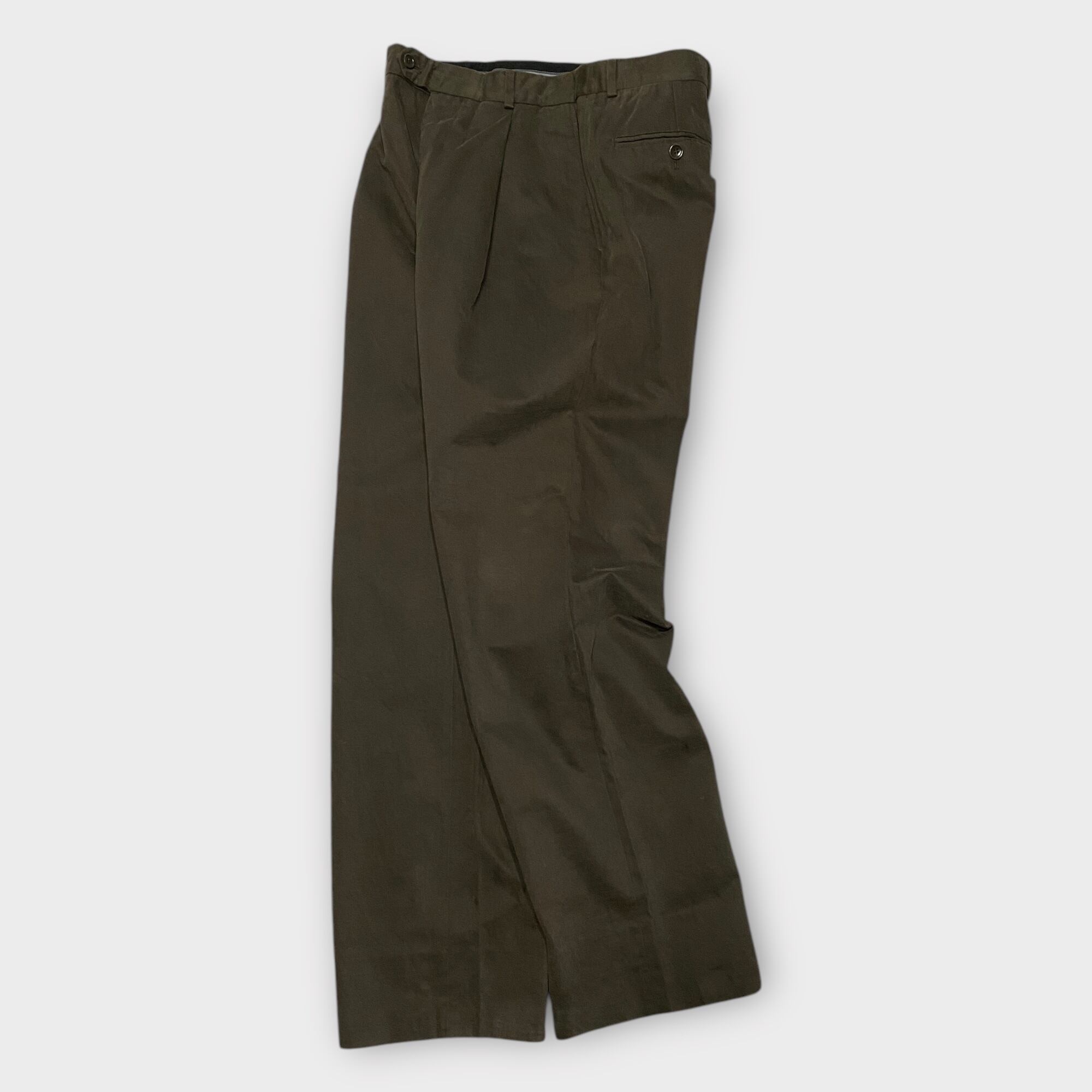 アルマーニ製のスラックス、桃の表面ような起毛感のある生地が魅力的です。オリーブがかったダークブラウンカラーに微ワイドなシルエットが特徴で、様々なシーンでの着用に対応できる汎用性の高い一着となっています。