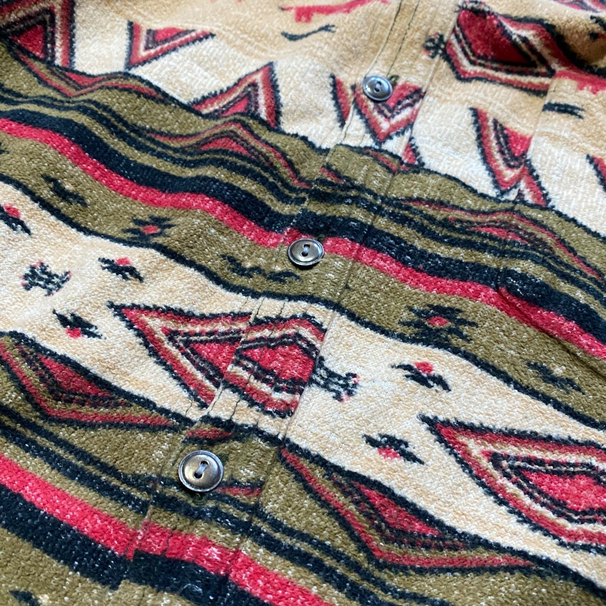 プリントパイル地を使用した独自のネイティブパターンが魅力のシャツです。地味に珍しい素材感が特徴で、メタルボタンとのギャップがスタイリングにアクセントを加えます。