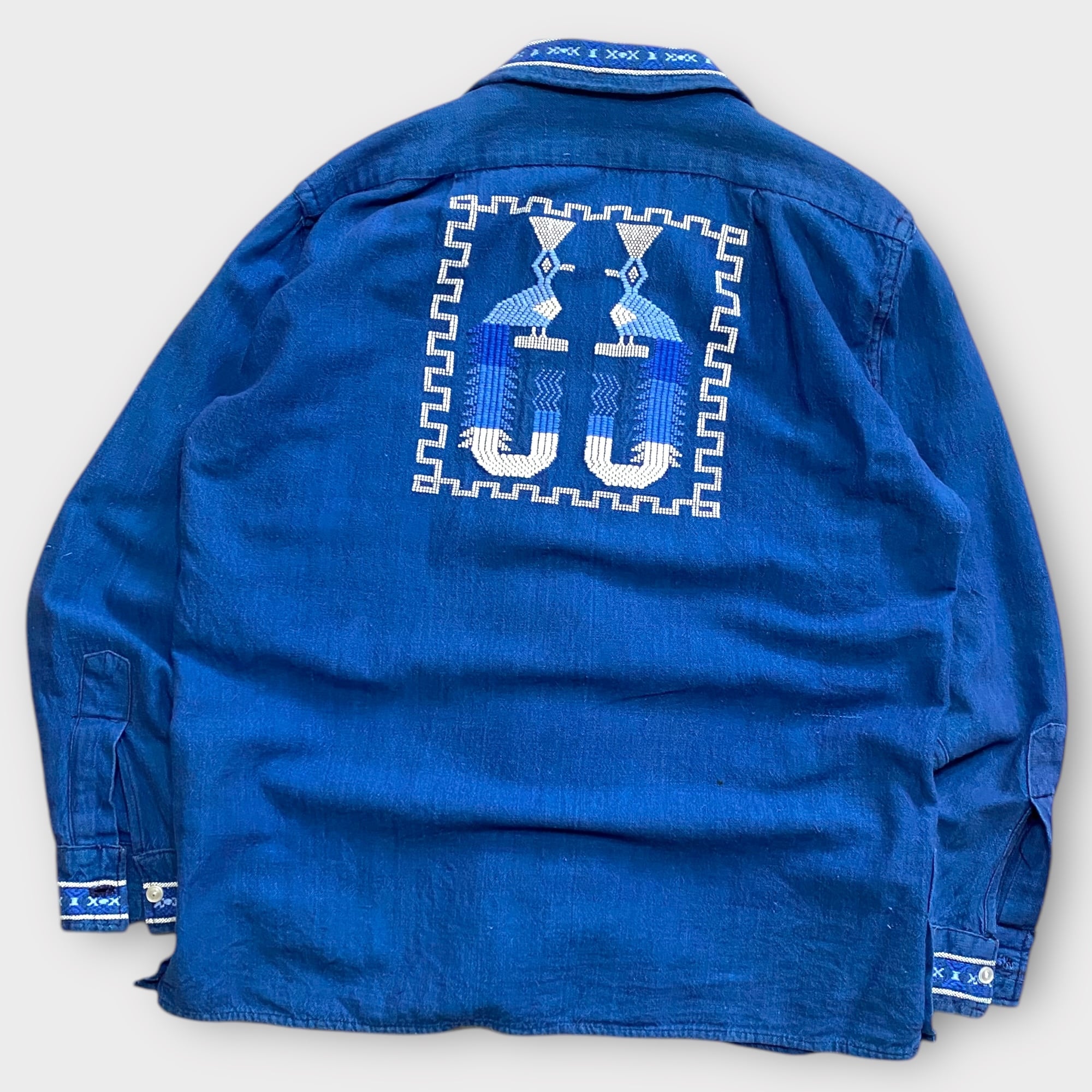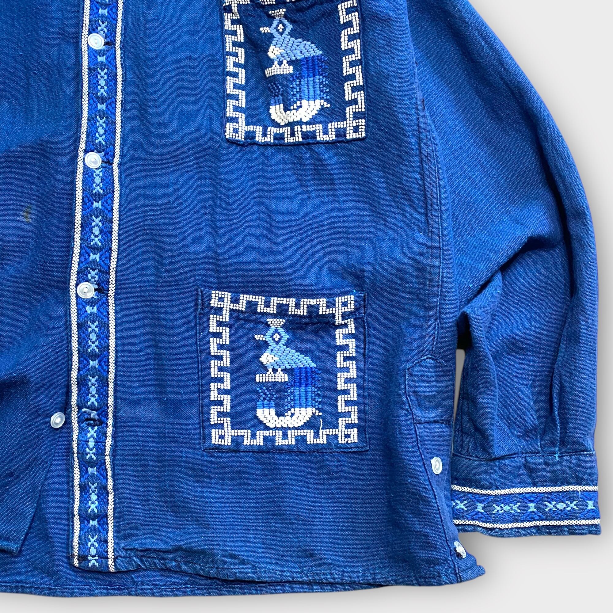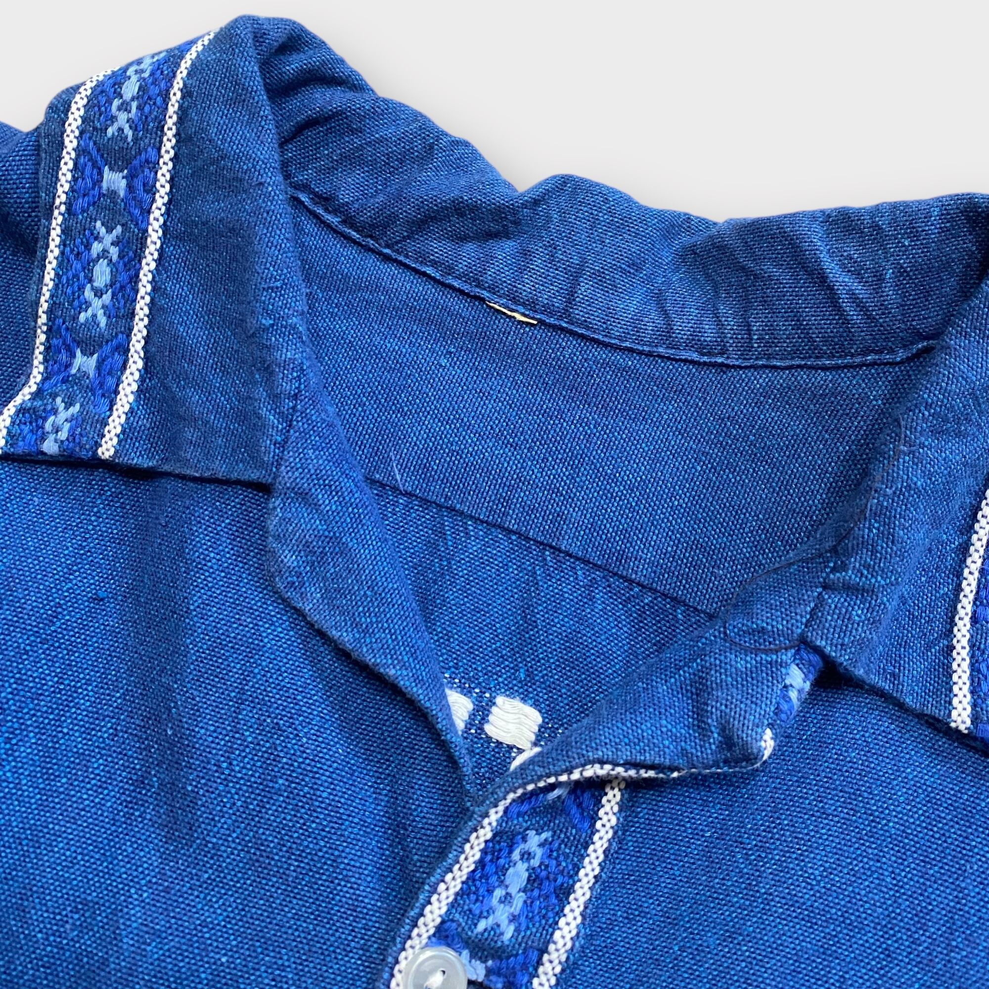 鮮やかなブルーのコットン地に、可愛らしい刺繍が施されたグアテマラシャツです。このシャツは、ネップ感のある風合いが特徴的で、通常のシャツにはない、独自の個性を引き立てます。